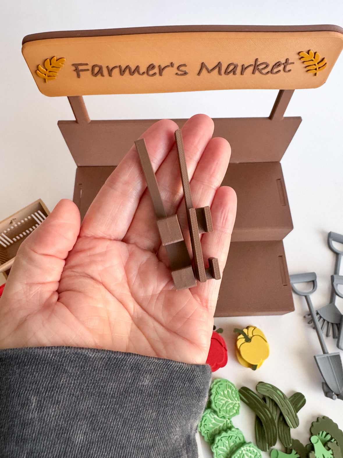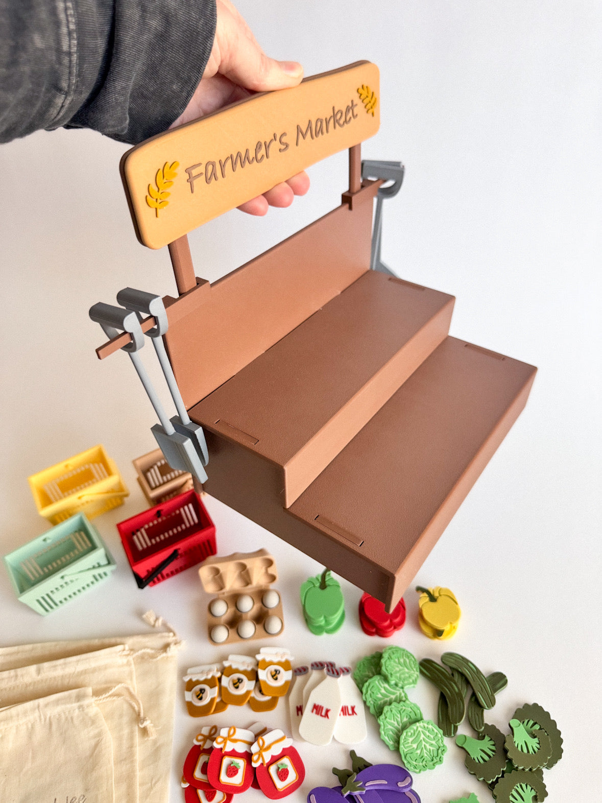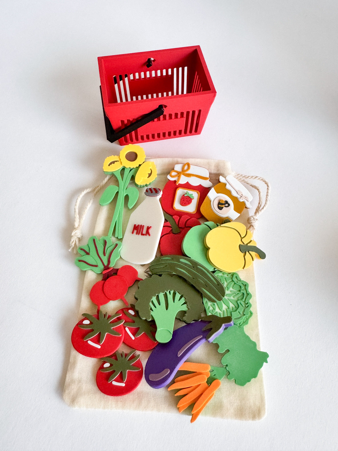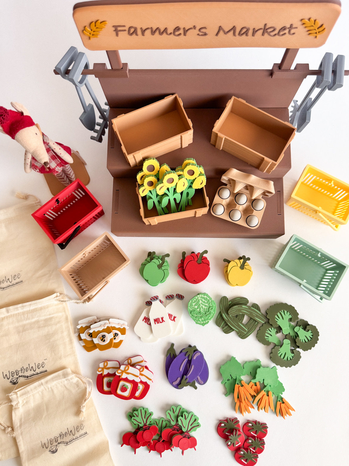 Egg Box – A charming carton with eggs securely glued inside for safe, worry-free play. Sunflower – Bright and cheerful, just like a real farm stand. Honey & Jam – Sweet little additions for imaginative food play. Vegetables & More – Fresh market favorites to stock your shelves and inspire storytelling.