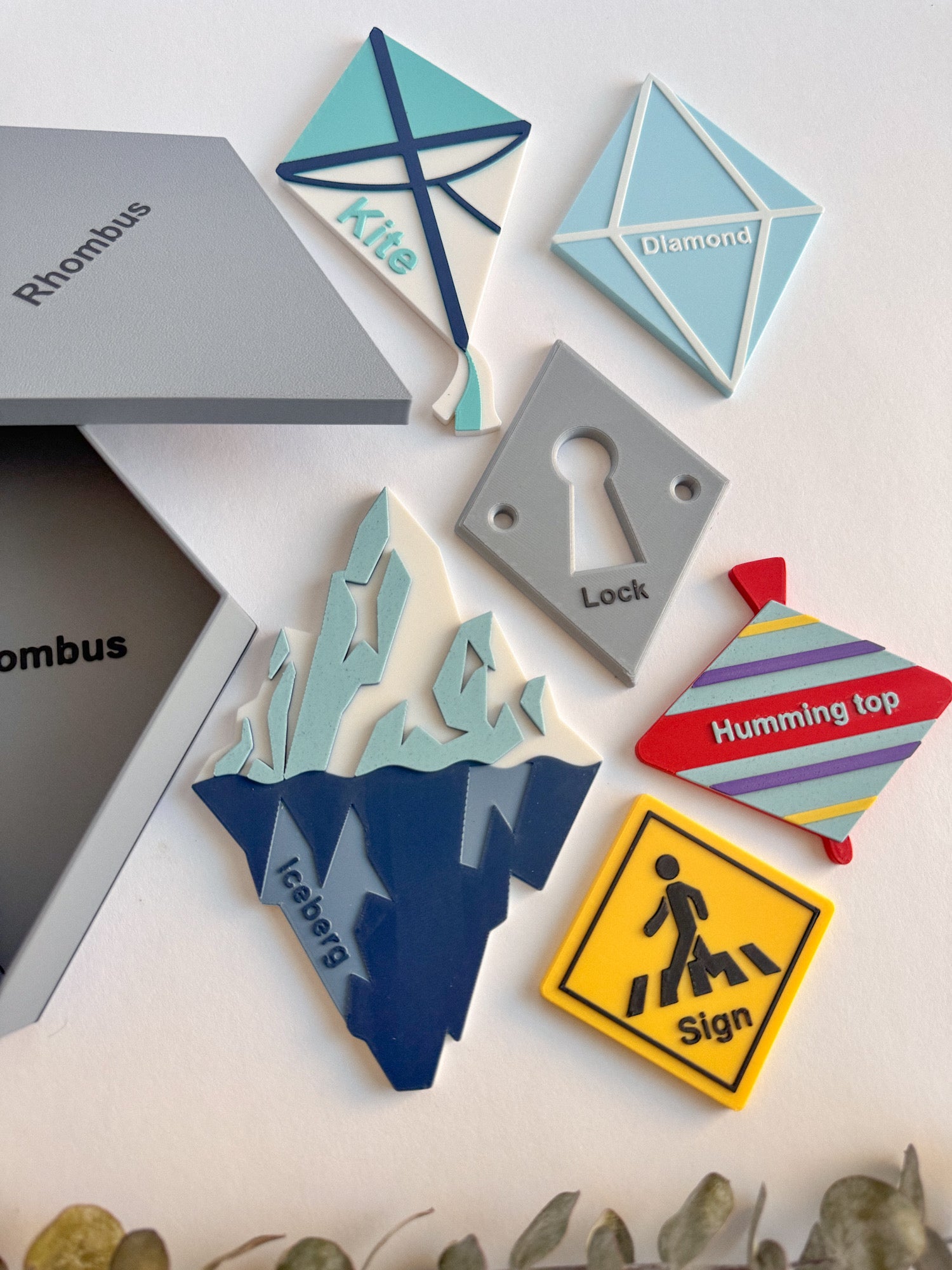 Every box or bag includes 6 large 3D-printed object cards, each representing real-life items that match the given shape. Each card features the written name of the object, supporting early literacy, vocabulary building, and language development.